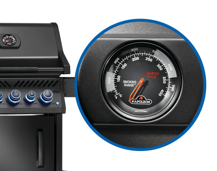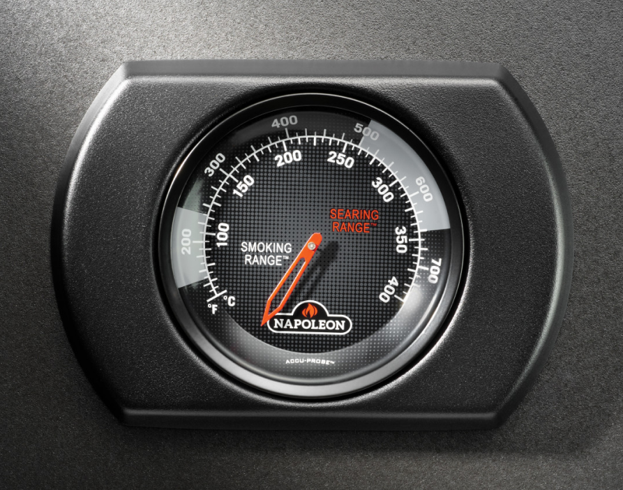 The hood-mounted Accu-Probe gauge is surprisingly accurate and provides an instant overview of your grill's internal temperature. While an external probe is always recommended for precise meat temperatures, this built-in gauge is excellent for monitoring ambient grill heat, giving you confidence in your cooking environment.