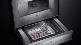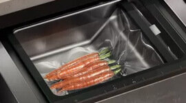 Designed for simplicity, the Gaggenau 400 Series Vacuuming Drawer fits into a 14 cm space, features a removable non-stick sealing bar for easy cleaning, and an automatic glass cover that opens after sealing, making food storage a breeze.