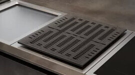 Crafted from 3 mm stainless steel, this grill is designed for both surface mounting with a visible edge and flush mounting, seamlessly blending into any kitchen design. With two 1500 W zones that can be used together or separately, and a two-part cast grill, it offers maximum flexibility. Safety is prioritised with pre-heat and residual heat indicators, while the stainless steel lava stone trough and grease collecting insert make cleanup easy. The Gaggenau 400 Series Vario Electric Grill combines high-end design with exceptional functionality, elevating your grilling experience.