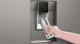 The fridge's convenient water dispenser with refillable tank eliminates the need for plumbing your refrigerator and ensures you always have access to chilled water. The Multi-Zone Air system evenly circulates cool air throughout the fridge, maintaining a stable temperature for ideal food storage conditions. Fruits and vegetables are kept fresh and flavourful in the Humidity Zone crisper drawer.
