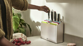 Everything you need to prep your ingredients are within reach thanks to the slimline storage case. Every single detail is meticulously and thoughtfully designed from the tiered arrangement of the chopping boards, to the knife-friendly texture on the cutting boards.