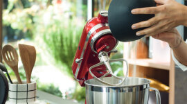The KitchenAid mixing head easily tilts back, allowing unobstructed access when you need to add more ingredients or when changing accessories. The unit’s interlock mechanism secures the head in place, meaning you can give your hands a rest and let the mixer work its magic.