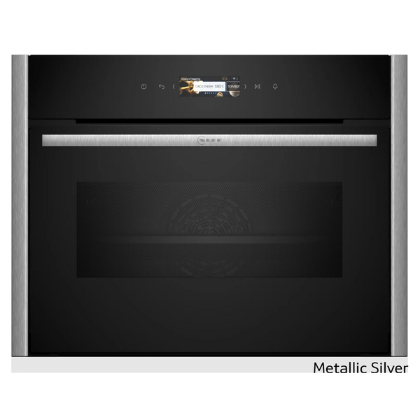 The NEFF Compact Oven with Microwave is the ultimate kitchen companion, ingeniously combining the traditional oven's versatility with the convenience of a microwave. This compact solution is designed for modern kitchens, offering a wide range of cooking methods from baking and roasting to quick microwave heating, all within a single appliance. Whether you're looking to bake a cake, roast a chicken, or simply reheat leftovers, this oven has you covered with its multifaceted cooking functions including top/bottom heating, Circo-roasting, full surface grill, and various microwave modes. Featuring a 3.7" Full Touch TFT Display, the oven provides a user-friendly interface that makes it easy to select and monitor cooking programs. The intuitive display enhances your cooking experience, allowing for precise control over all oven functions. This compact oven is not just about performance; it also excels in style. Available in four elegant colours—Anthracite Grey, Brushed Bronze, Deep Black, and Metallic Silver—it's designed to complement any kitchen décor. With a 900W microwave power setting, the NEFF Compact Oven ensures efficient and quick cooking, making it perfect for those times when you need a meal in a hurry. The addition of Easy Clean and Home Connect features further enhances its appeal. Easy Clean simplifies the maintenance process, ensuring your oven remains spotless with minimal effort, while Home Connect brings smart technology to your kitchen, allowing you to control and monitor your oven remotely. This NEFF Compact Oven with Microwave is not just an appliance; it's a versatile cooking solution that blends efficiency, convenience, and style into one compact package, making it an essential addition to any kitchen looking to maximize functionality without compromising on space.