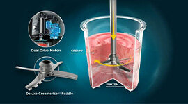 The dual-drive motor exerts downward pressure while spinning the Professional 'Creamerizer' paddle, finely shaving ice particles and transforming them into smooth, delicious treats.